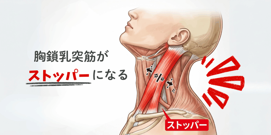 むしろ、頭を後ろへ倒そうと意識した瞬間に、首の前側にある「胸鎖乳突筋(きょうさにゅうとつきん)」がギュッと短縮してしまいます。