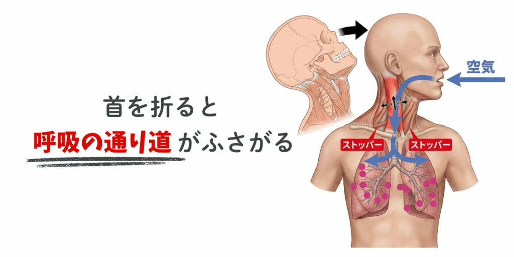 しかし、頭を後ろに預けて首を折ってしまうと、喉元にある大切な呼吸の通り道(気道)がギュッと押し潰されてしまいます。