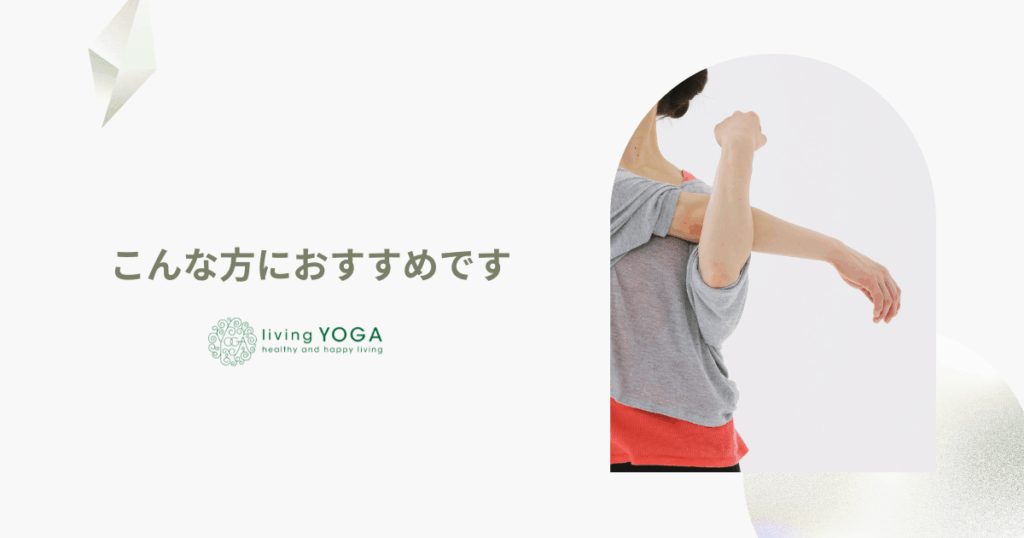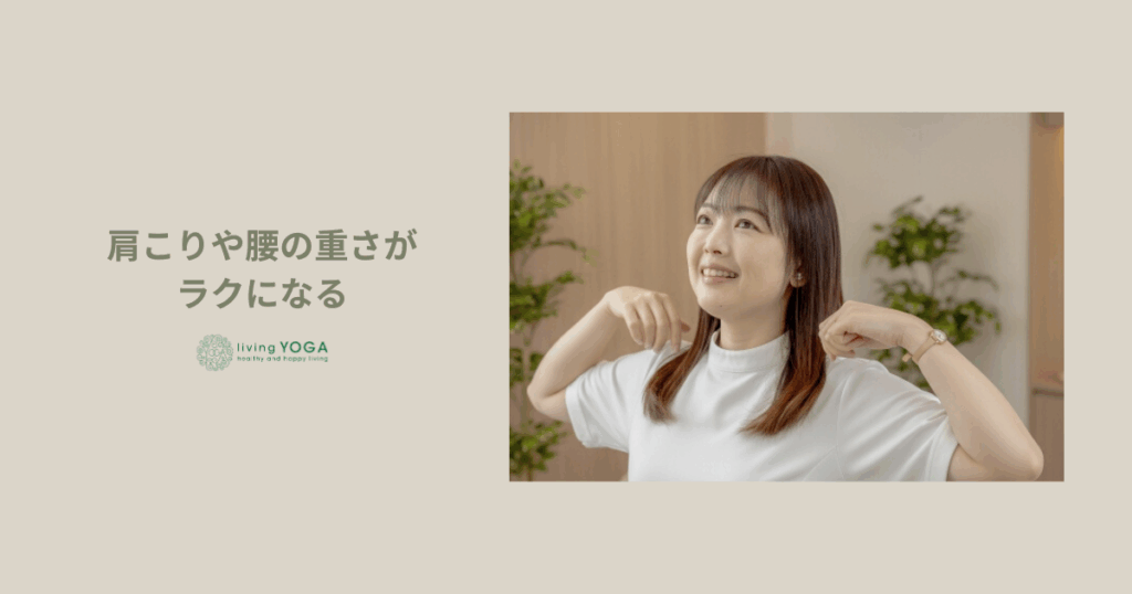 ヨガでは、呼吸に合わせて肩甲骨や背骨まわりをやさしく動かすことで、筋肉のこわばりが自然にゆるんでいきます。